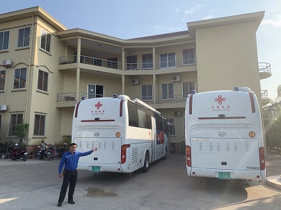 左と中;カンポット保健省でのミーティング、右;中国から贈与された検診用バス。Dr.Khun と患者健康ノートの活用方法について協議した。