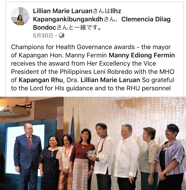 ●フィリピンでは、長年協力活動をを継続してきたベンゲット州カパンガンが、政府のGood Health Governance表彰を受けました。また、保健センターRHU医師のDr.Laruanが、保健省の公衆衛生分野で全国5人の医師の一人に選ばれて表彰される栄誉を受けました。イデアが協力している患者健康手帳活動も評価されての栄誉で、喜んでいます。